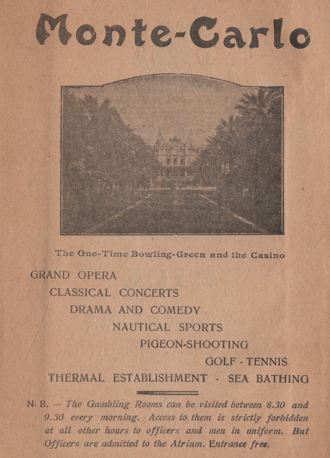 As for the Casino: “N.B. The Gambling Rooms can be visited between 8.30 and 9.30 every morning. Access to them is strictly forbidden at all other hours to officers and men in uniform. But Officers are admitted to the Atrium. Entrance free.”
