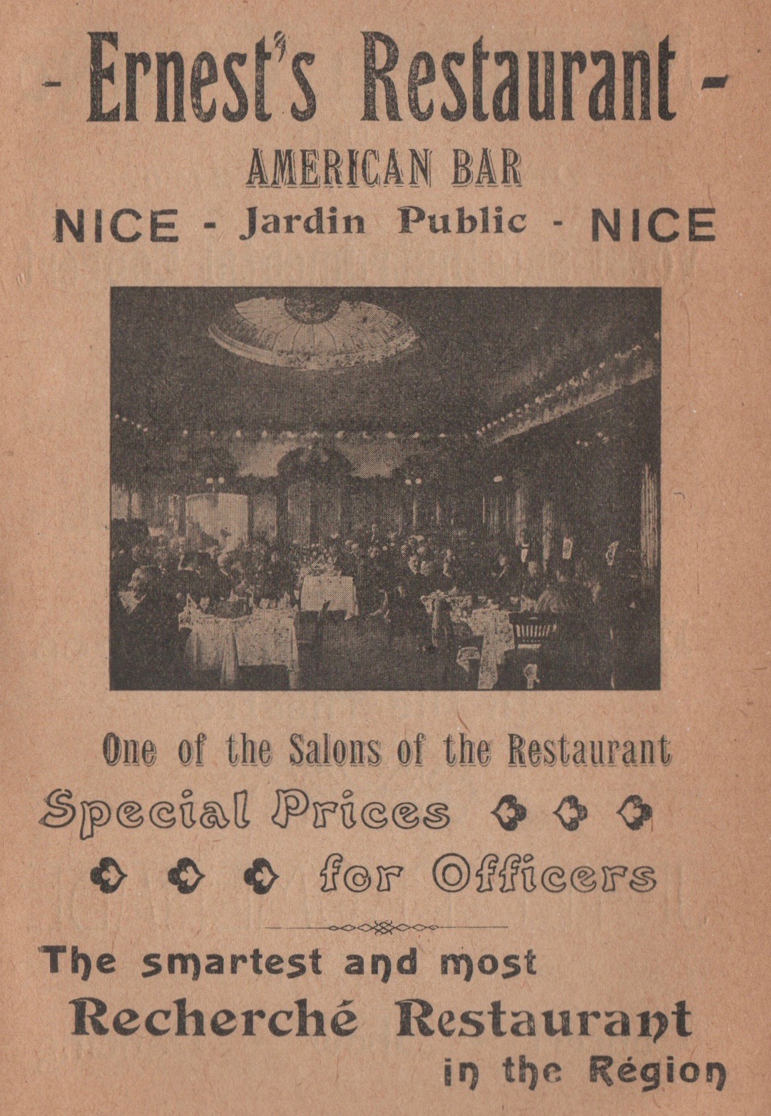 With the uniform once again fit for an officer, dining was a possibility at Ernest’s Restaurant, “The smartest and most Recherché Restaurant in the Région,” with “Special Prices for Officers.”
