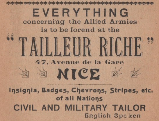 If the Maxicing at Salle-Schiano led to roughhousing, Tailleur Riche was always available for replacing the “Insignia, Badges, Chevrons, Stripes, etc. of all Nations, English Spoken.”