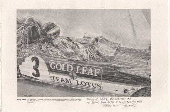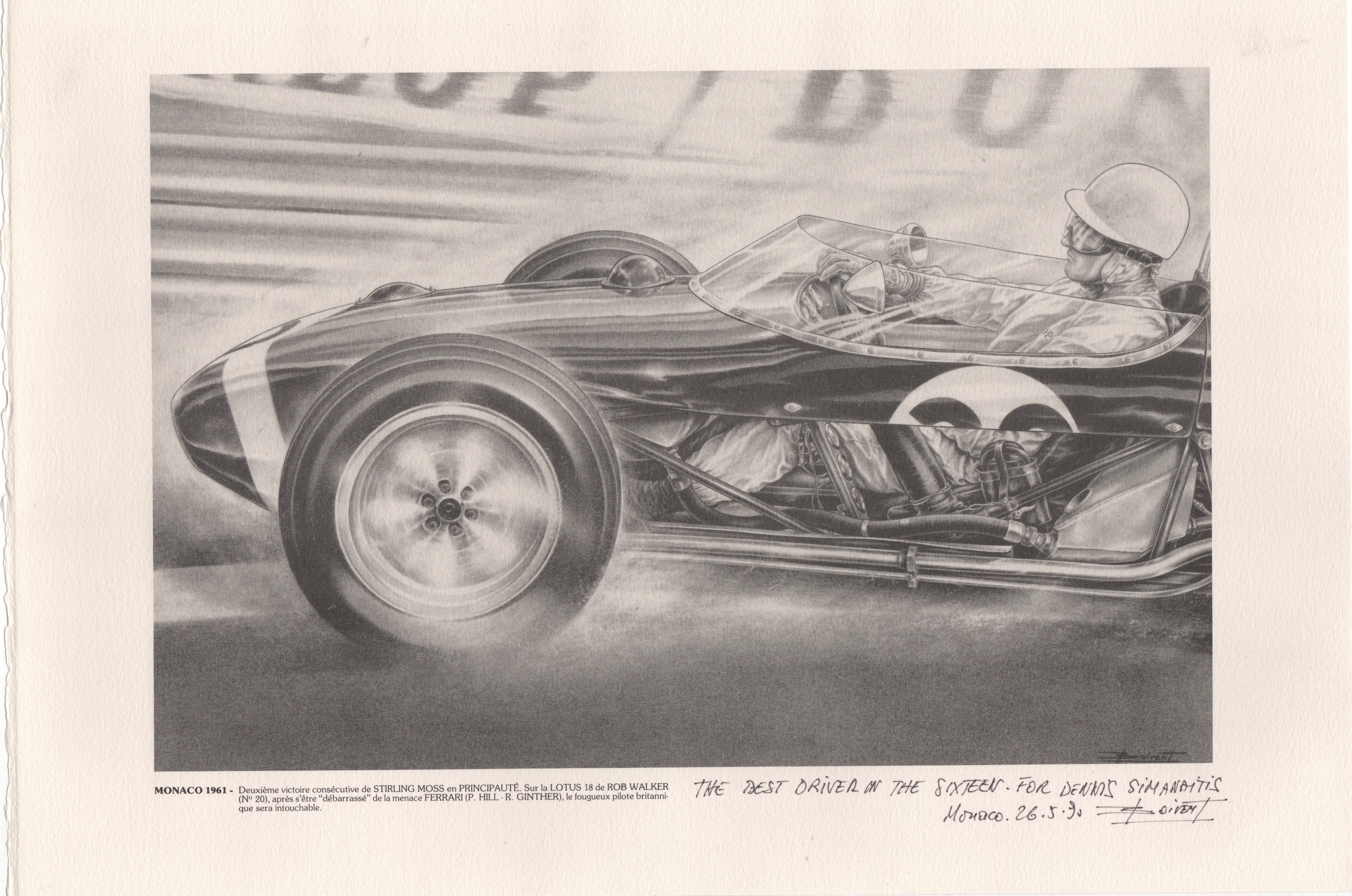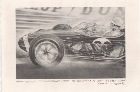 Monaco 1961 – Stirling Moss in Rob Walker’s Lotus 18, by Jean-Pierre Boivent. This and the following prints, 11 1/4 in. x 16 1/2 in., in black lead on handmade woven paper.