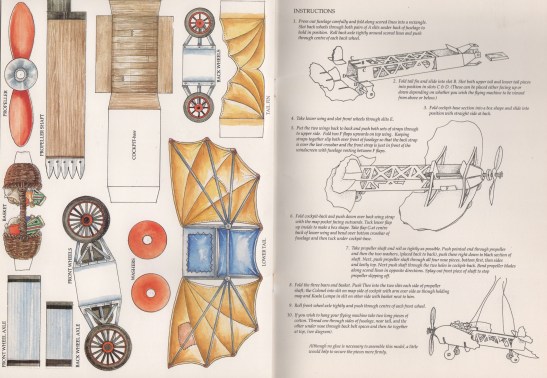 “THEO JUST INHERITED his Grandfather’s flying machine. It had become a little rusty and broken, but Theo set to work to repair it.” And thus begins this charming little book with six pages of heavy-stock pieces to press out and assemble. There’s the aeroplane, Theo the bear and his pals. the Colonel and Koala Lumpa.