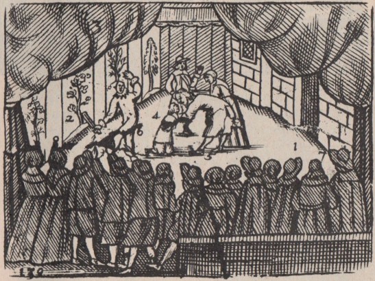 Actors performing in a playhouse. Woodcut from Orbis Sensualium Pictus, Comenius, 1689. This and the following images from The Annotated Shakespeare.