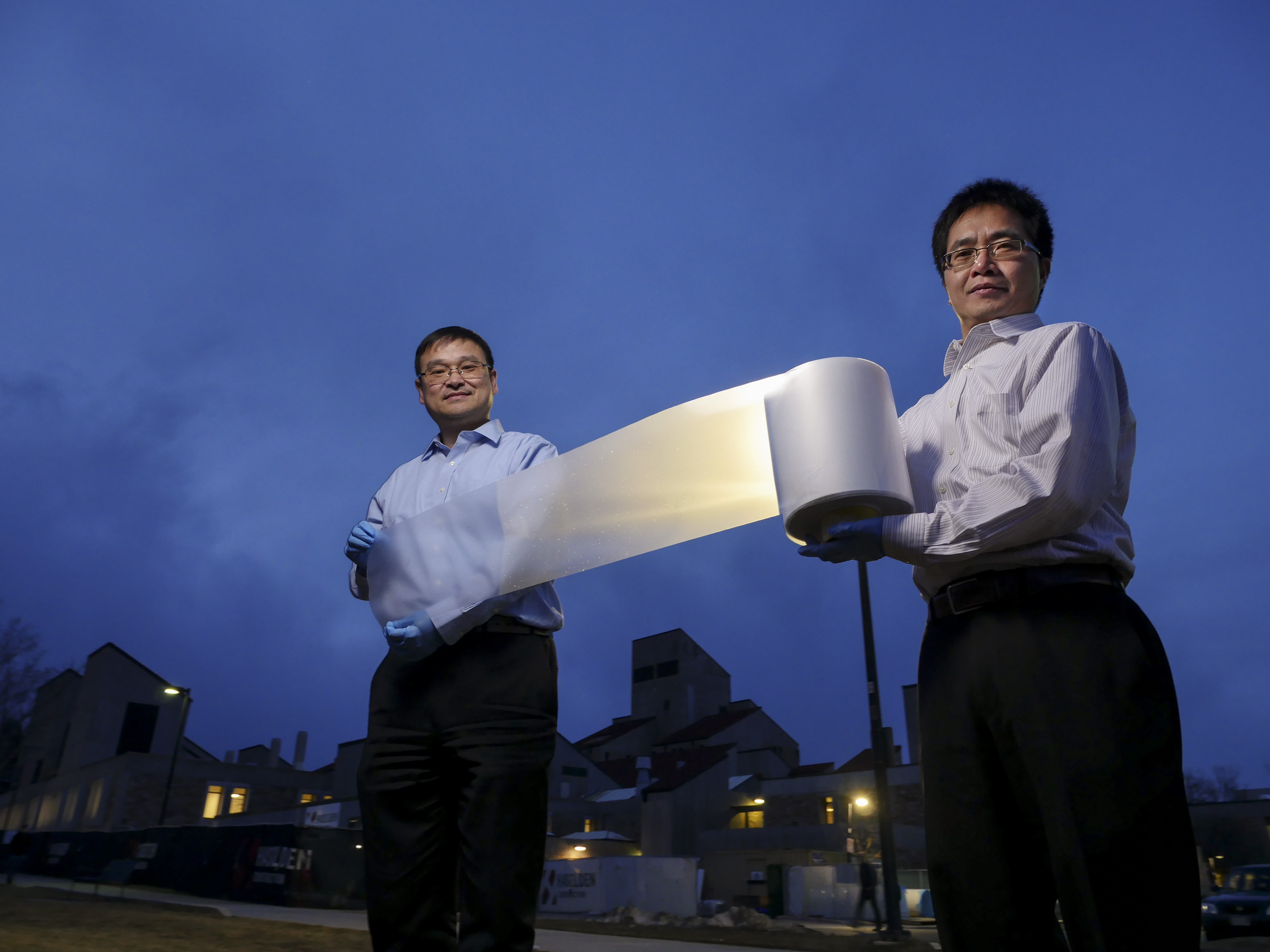 Radi-Cool’s Xiaobo Yin, left, and Ronggui Yang hold a roll of the company’s passive radiative cooling film. This and the following image from Radi-Cool, Inc.