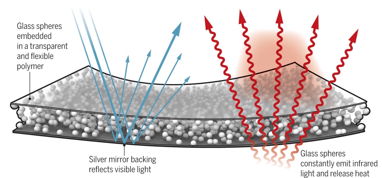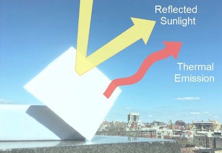 “PASSIVE RADIATIVE COOLING” can lower a surface’s temperature by around 10 degrees Fahrenheit. Think of images of Greek isles, with sun-baked buildings painted white to keep cool.