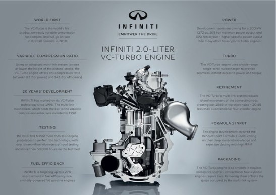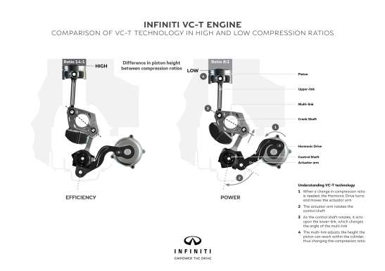 The amount of squeeze is characterized by an engine’s compression ratio. For instance, an 8:1 c.r. compresses the charge to one-eighth of its original volume; a 14:1 c.r., to a much more compressive one-fourteenth. Not coincidentally, these are the two c.r extremes of Infiniti’s and the world’s first production VC-Turbo engine, of which more anon.