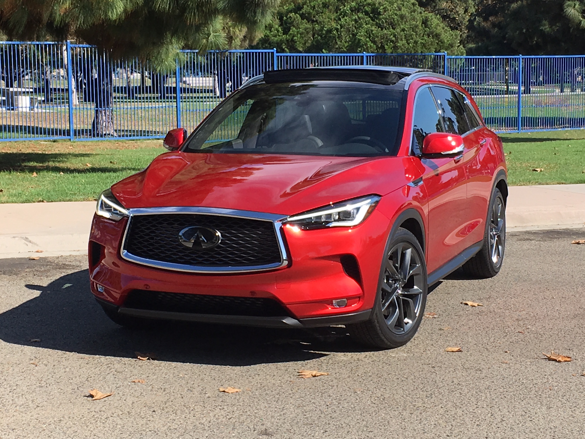 Our QX50 had an MSRP of $55,620, the addition including a Sensory Package ($7500 of luxury, convenience, and performance spiffs, things like leather seating, the front seats heated and cooled, a 16-speaker Bose Performance Series audio, motion-actuated liftgate, P255/45-R20 low-profile tires, and 14 other features), a ProActive Package ($2000 of ProPilot Assist, Intelligent Cruise Control with Full Speed Range and Hold, Lane Departure Warning and Prevention, Blind Spot Intervention, and several other safety features), and a ProAssist Package ($550 of Backup Collision Intervention, Distance Control Assist, and Rear Cross Traffic Alert). Our QX50’s Exclusive metallic red ($800) and Welcome Lighting ($425) completed the Monroney total.