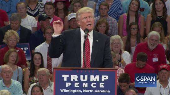 Trump during the 2016 campaign in Wilmington, North Carolina, August 9, 2016: “If she gets to pick her judges, nothing you can do, folks. Although the Second Amendment people—maybe there is, I don’t know.” Image by Evan Vucci/AP.