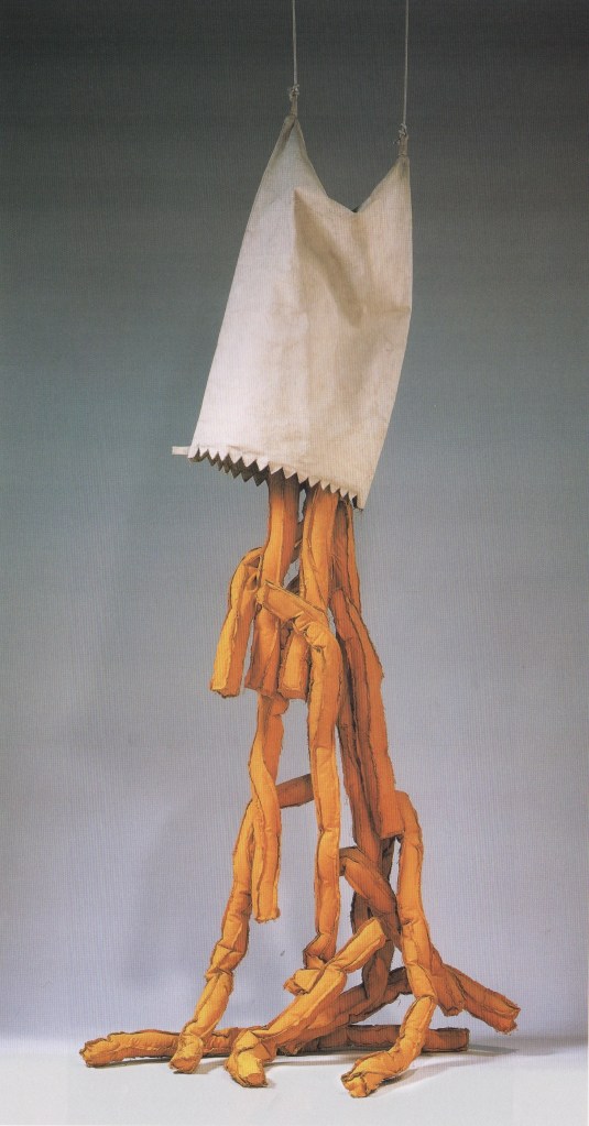Claes Oldenburg, Stockholm-born 1929, is an American artist best known for his public art installations featuring oversize replicas of everyday objects. James notes, “Gravity, traditionally the sculptor’s enemy, is here enlisted as an ally, to bring the luridly painted ‘shoestring potatoes’ cascading down around the viewer’s head.”