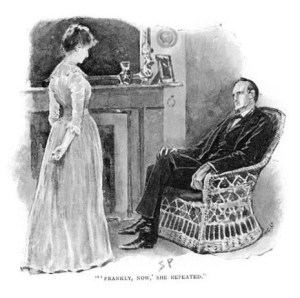 Mrs. Neville St. Clair with Holmes. Image by Sidney Paget in “The Man with the Twisted Lip,” the Strand Magazine, December 1891.