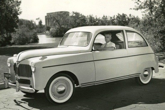 The Ford Soybean Car, unveiled on August 13, 1941, at Dearborn Days, Dearborn, Michigan. The car’s designer, Lowell Overly, is at the wheel.