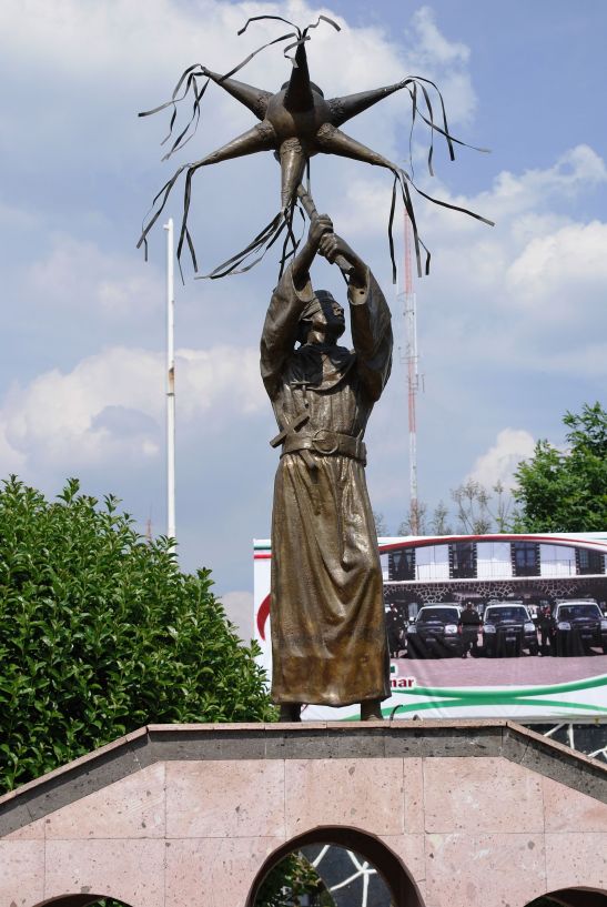 A statue commemorates a blindfolded monk hitting a seven-pointed piñata in Acolman, just north of today’s Mexico City. Image by AlejandroLinaresGarcia.