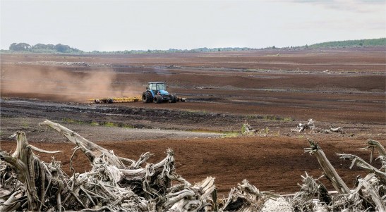 Large-scale peat harvesting: Drained land is stripped of its moss and heather to uncover the carbon-rich peat. Image from Science, December 14, 2018.