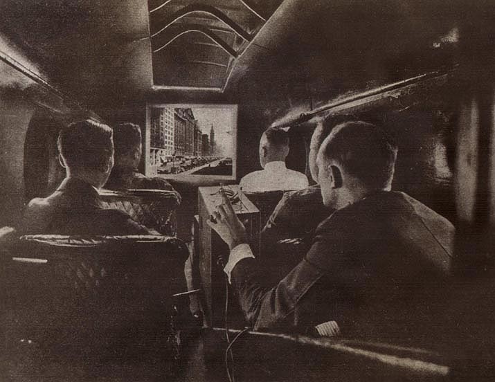To accomplish this feat, a screen was set up in an Aeromarine 75 forecabin, with a DeVry suitcase projector connected to one of the aeroplane’s electric light sockets. “Before the flight,” Aeromarine notes, ”it was feared that the vibration of the giant hydroplane as it shot through the air at 90 miles an hour would seriously interfere with the screening. It did not.”