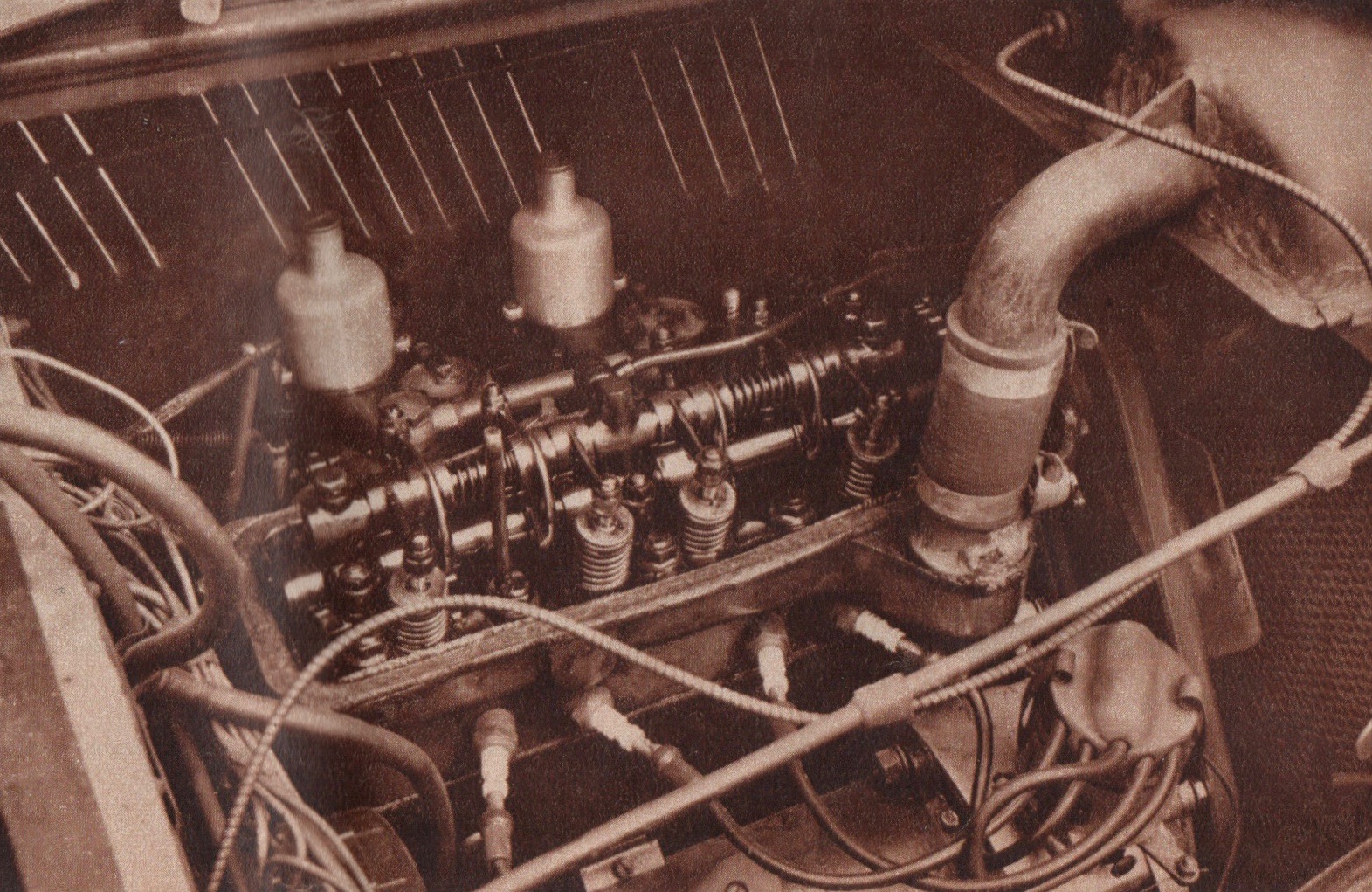Typically long-stroked (to keep its RAC rating low), the Singer had a 60-mm bore and 86-mm stroke, a 972-cc displacement, and produced 38 hp at 5000 rpm. The engine’s cam cover is removed here to show its overhead camshaft, a small-car rarity in the era.