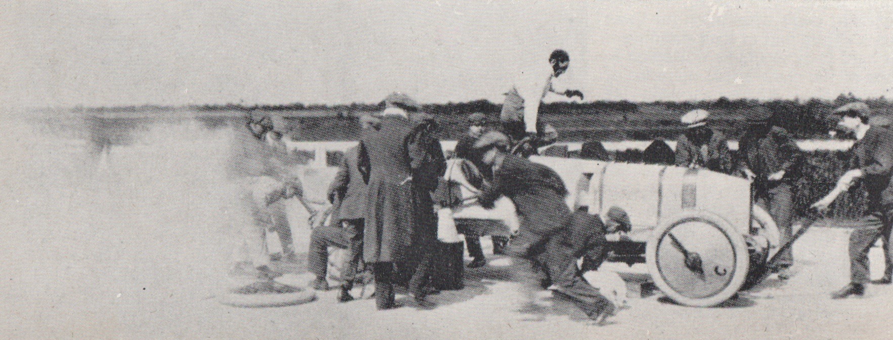 A Brooklands pit stop. W.C. Scott, the works driver, is replaced by L.C. Hornsted. The pit staff is overseen by chief engineer Henri Perrot.