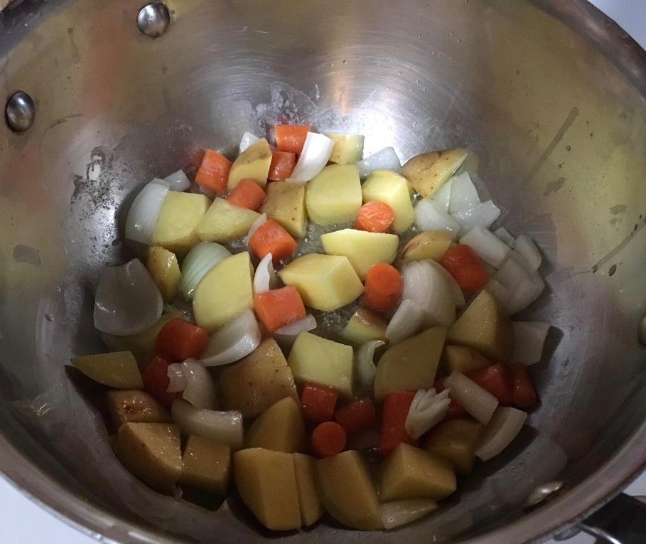 Add the onion, potatoes, carrots, sausage, garlic, and Brussels sprouts successively as you perform each chopping, cubing, slicing, etc.