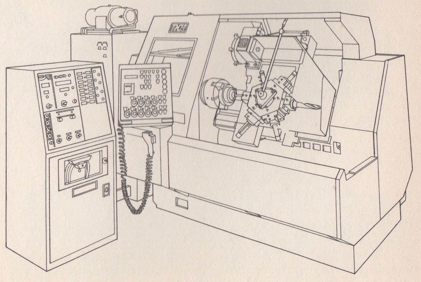 A TNC Combi turret lathe, with its operation board at the left. Since the computer program can be rapidly changed, such NC machines are well suited to manufacture work with multiple details in short series.