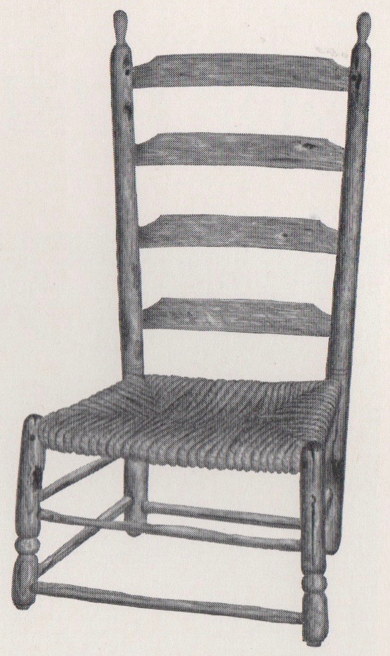 Ladderback Chair, oak(?), seat of twisted corn husks, made by Arthur Pimar, Alachua County, Florida; mid-nineteenth century. Rendered by Annie B. Johnston, Florida Project.