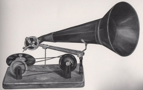 Gramophone, wood with tin horn and rubber bands, designed by Emile Berliner, made by the United States Gramophone Company; 1887. Rendered by Charles Bowman, Maryland Project.