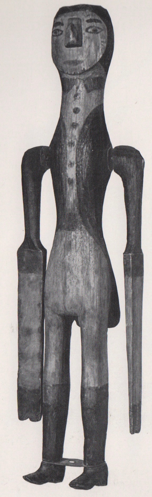 This whirligig isn’t a toy; it’s a variation on the weathervane theme. Christensen noted, “It measures thirty inches and was used out of doors, installed so that the arms would be made to rotate with the wind.”