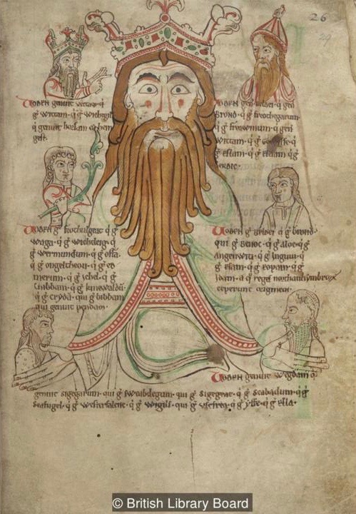 A 12th-century manuscript shows Woden, the chief Anglo-Saxon god, surrounded by royal personages of Wessex, Bernicia, Deira, Mercia, and Kent.