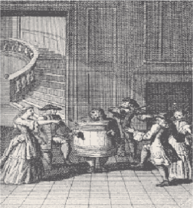 On the other hand, George Etherege’s play The Comical Revenge, or Love in a Tub, 1664, involved a fellow who lost his trousers. Engraving by Louis du Guernier.