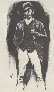 “… he wore across the upper part of his face, extending down past the cheek-bones, a black vizard mask, which he had apparently adjusted that very moment…” This and the following illustrations by Sidney Paget for the Strand Magazine, July 1891, from The Annotated Sherlock Holmes.