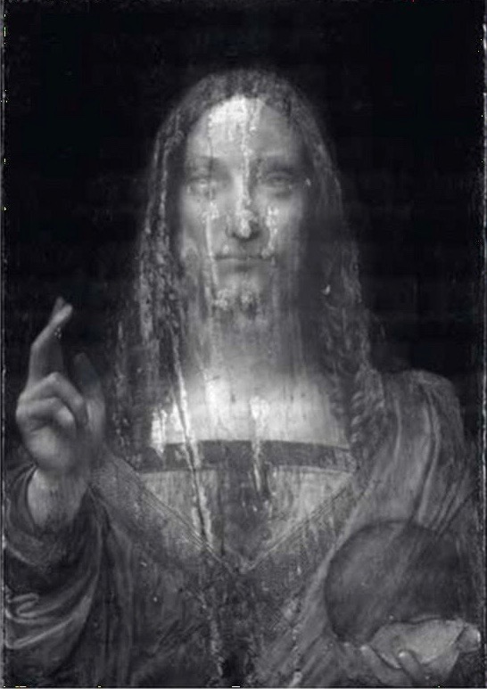 An infrared reflectogram of Salvator Mundi. Image from artwatch.org.uk.