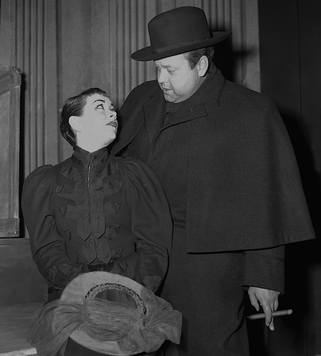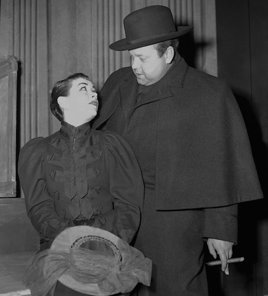 Orson Wells (Actor Manager/Captain Ahab) with Joan Plowright (Young Actress/Pip) in Moby Dick—Rehearsed, Duke of York’s Theatre, London, 1955. Image by AP.