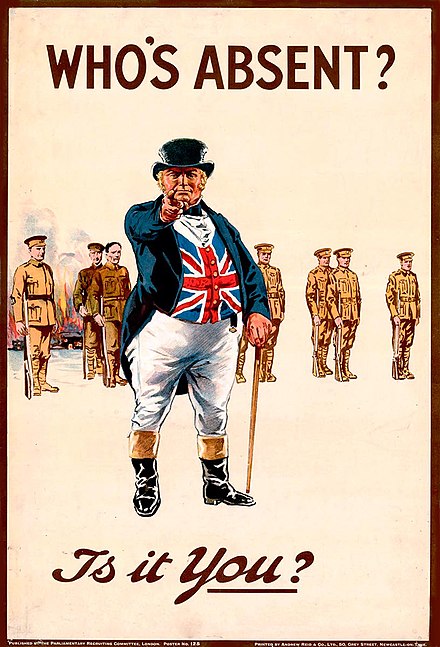 J.M. Flagg’s 1917 poster was based on an earlier British poster of Lord Kitchener, shown below. Note Kitchener’s huge handlebar mustaches; Uncle Sam is said to resemble artist Flagg, who was clean-shaven with chiseled features.