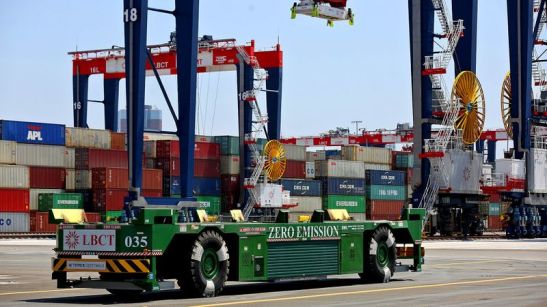 Driverless battery electric vehicles are proposed to replace diesel rigs at the ports. Image by Rick Loomis/Los Angeles Times.