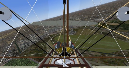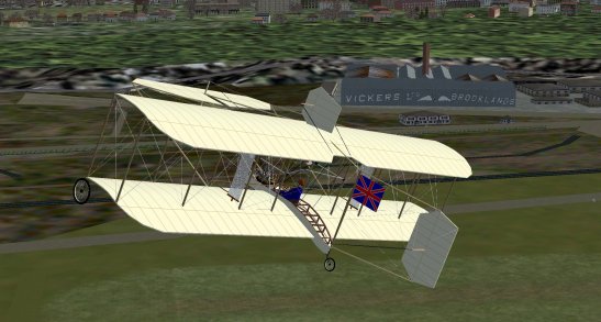 That’s Brooklands Circuit ahead in this cockpit view. (Actually early aeroplanes didn’t really have cockpits per se.)