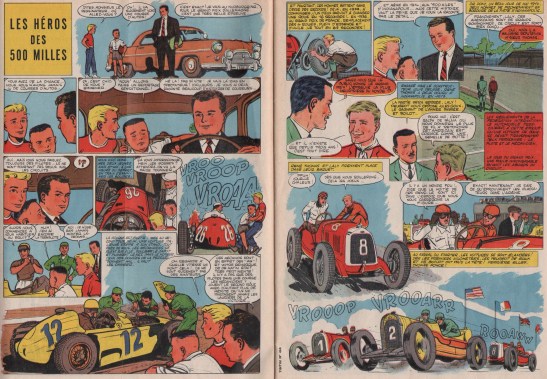 Appropriately enough, the magazine leads off with “Les Héros des 500 Milles,” a four-page thriller replete with plenty of Vroo Vroop Vroaa Vrooarr! The tale celebrates the mechanics’ role, particularly in the early days when a riding mechanic was de rigueur.
