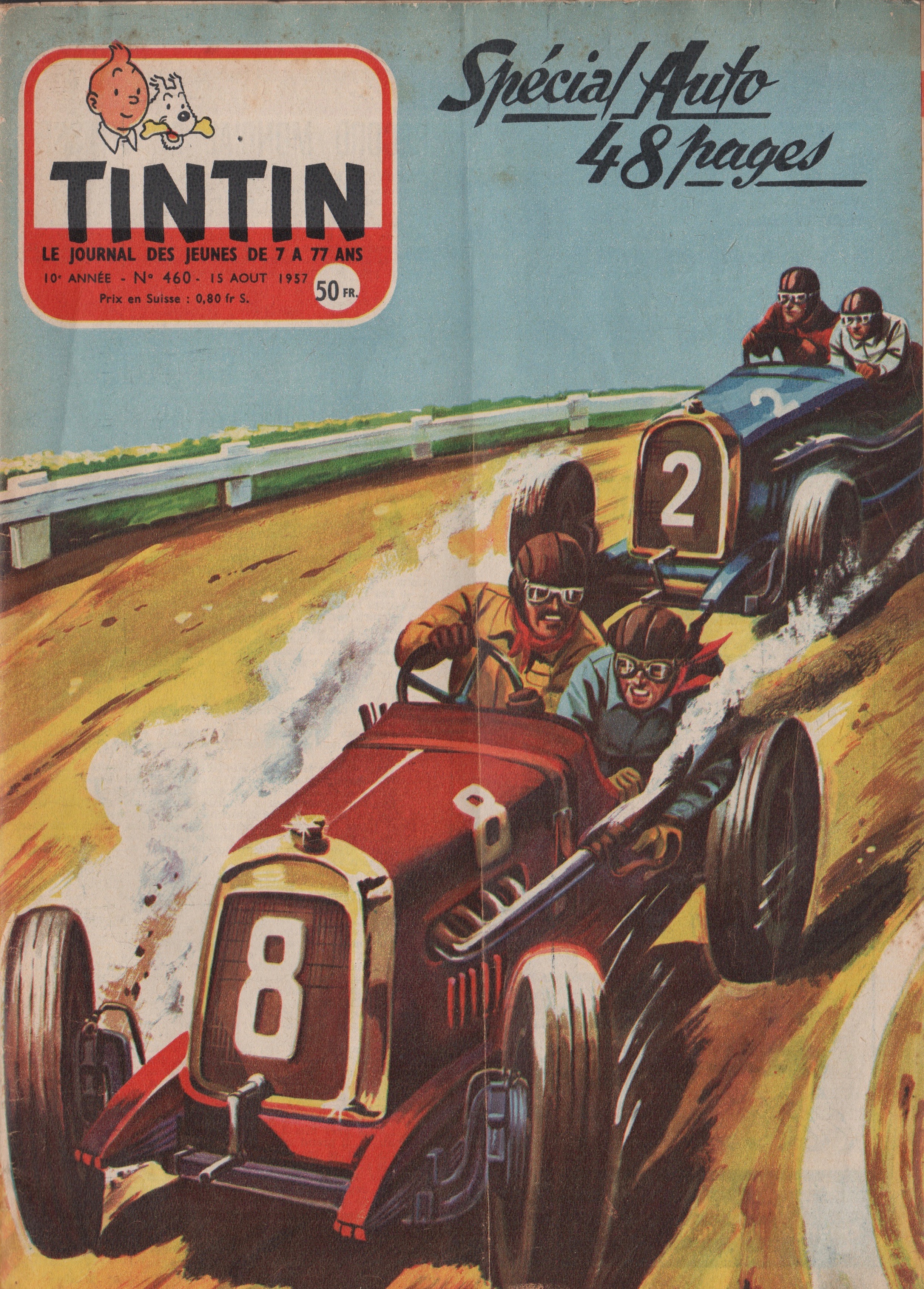 I paid a bouqiniste 4€ (about $5.30) for my wrapped, mint-condition Tintin magazine, acquired during one of my early retirement stays in Paris in the 1990s. Dramatic racing cars on the cover and a “Spécial Auto 48 Pages” blurb clinched the deal.