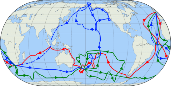 The routes of Captain James Cook’s three Pacific voyages. The first is shown in red; the second in green; and the third in blue. The dashed line shows his crew’s route after his death in Hawaii (of which more anon). Image by Jon Platek.