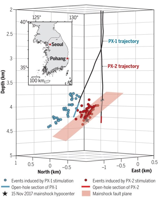 EGS Tradeoff. Lee, et al continue, “On the afternoon of November 15, 2017, the half-million residents of Pohang experienced violent shaking in an Mw 5.5 earthquake. The earthquake injured 135 residents, displaced more than 1700 people into emergency housing, and caused more than $75 million (USD) in direct damages to more than 57,000 structures and more than $300 million of total economic impact, as estimated by the Bank of Korea.”