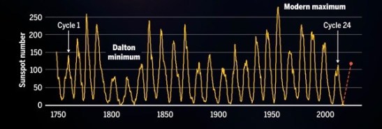 A Capricious Sun. “The cycles are capricious, however,” Scoles notes. “Sometimes the Sun goes quiet for decades, with anemic sunspot counts across several cycles —as occurred during the 19th century’s so-called Dalton minimum.”