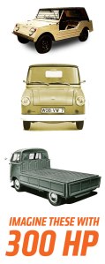 I like the idea of a 300-hp Thing. I once rented a Thing to drive around the Caribbean island of St. Martin, and the extra power would have been a blast.