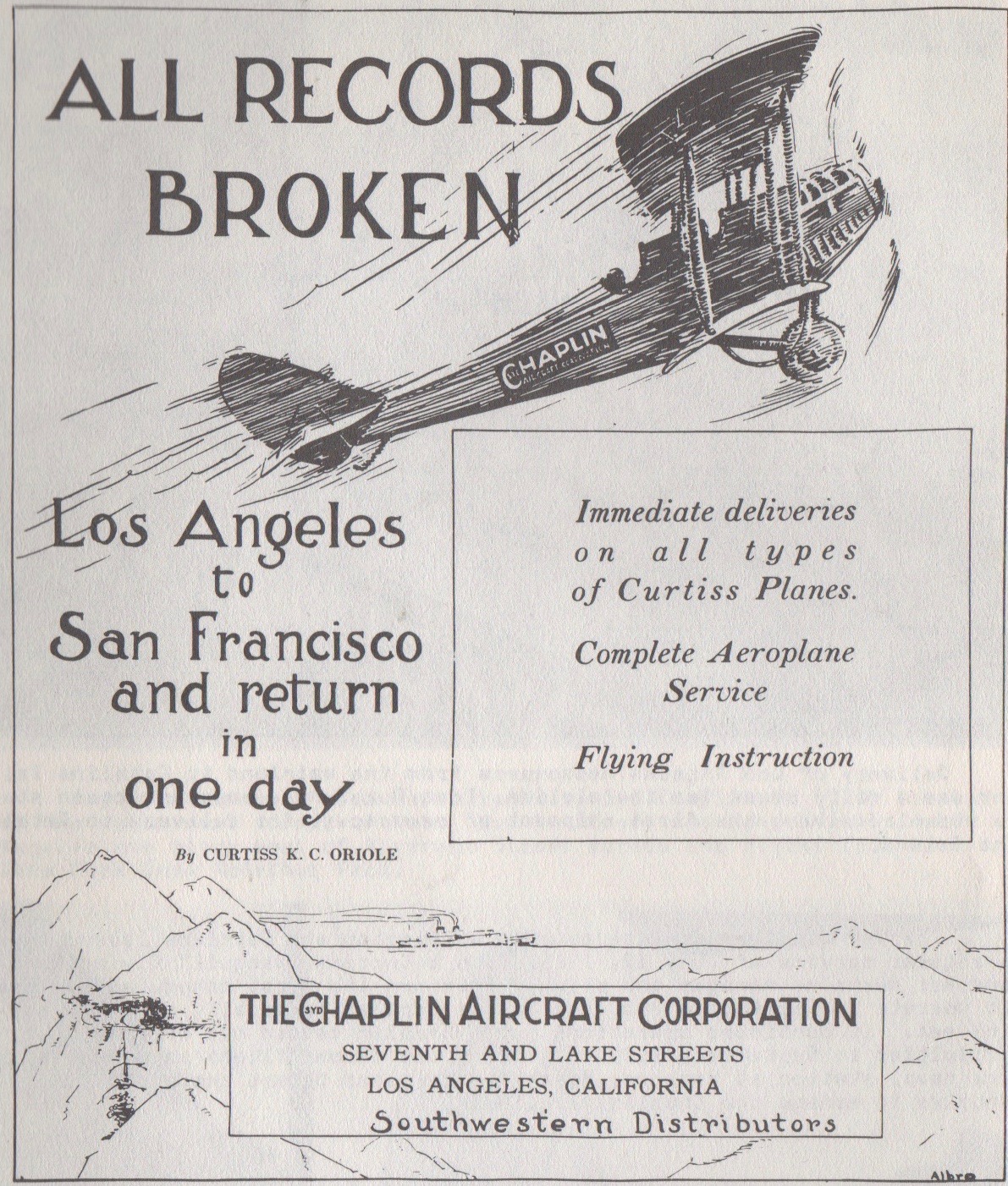 All Records Broken. Chaplin-Air-Line went out with a significant publicity coup: Los Angeles to San Francisco and return in one day. As described in Los Angeles Aeronautics 1920-1929, “A Los Angeles bank received a cablegram from the Sumitoma [sic] Bank of Osaka, Japan, on Friday evening, October 17, 1919, asking that certain securities be placed on a ship leaving San Francisco the next day in order that they would reach Osaka by November 1st.”