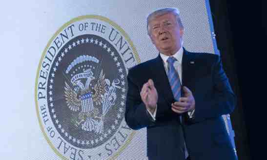 Imagine the hoot, though, when Trump spoke July 23, 2019, at a rightwing Turning Point USA rally held at the Marriot Marquis in Washington, D.C. Behind him was projected a Presidential Seal that had been altered satirically.