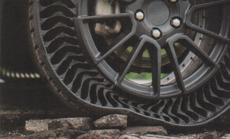 Terry Costlow gives details in “Michelin, GM Partner on Airless Wheel for 2024,” SAE International Automotive Engineering, July/August 2019: “This novel structure, which has been long in development and is covered by about 50 patents, is made with aluminum, rubber components, and resin-impregnated fiberglass.”