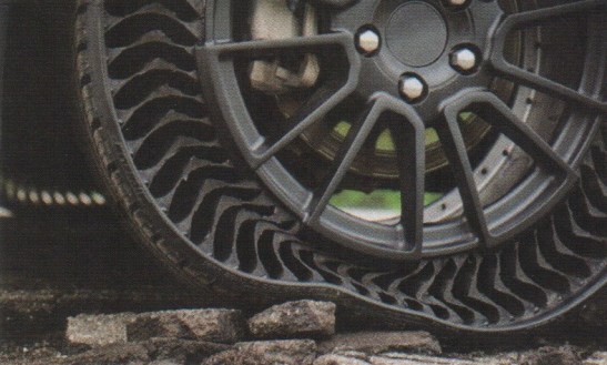 Costlow writes, “The airless structure eliminates the possibility of blowouts, improving safety and ensuring that drivers won’t be stranded by flats.” Michelin’s Eric Vinesse is quoted estimating that 200 million tires annually are discarded because of punctures.