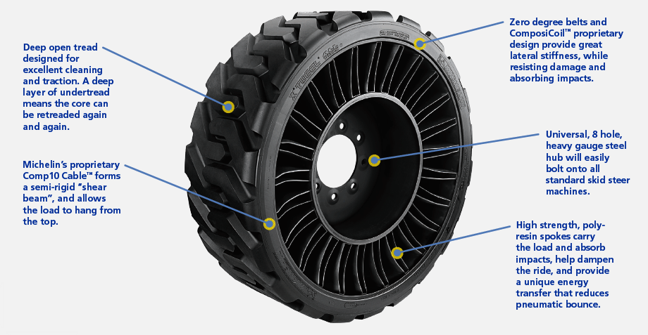 The Michelin Newsroom offers details on other Tweels, including its SSL All Terrain designed for skid steer loaders. Michelin cites advantages beyond the evident damage resistance: These include “exceptional operator comfort, reduced operator fatigue, improved productivity, and longer wear than standard pneumatic tires.”
