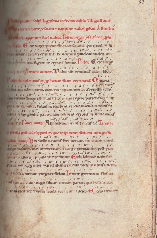 A Handy Breviary Format. De Hamel says the manuscript’s binding resembles that of a Breviary. “A Breviary,” he writes, “was (and for monks still is) the standard compilation of psalms and readings for the church year recited during the daily offices from Matins to Compline…. The resemblance is not merely in shape and size, but also in the page layout with nearly every sentence beginning with a red initial, like the verses of psalms, and the insertion here and there of specimen lines of musical notation above the script as often in Breviaries.”