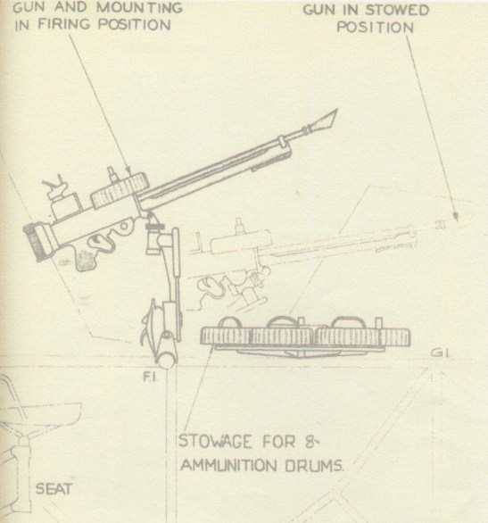 Machine Guns Fore and Aft. A gunner residing in Lizzie’s aft cockpit opened the rear greenhouse to fire a Lewis machine gun carried on a rocking pillar mount. Eight ammunition drums replenished the Lewis.