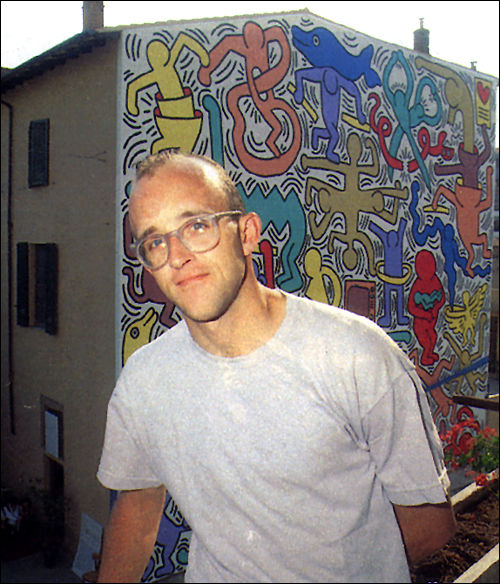 Keith Haring, 1958–1990, American artist initially known for his spontaneous drawings in New York City subways. Photo adjacent to his mural in Pisa, Italy, 1989.