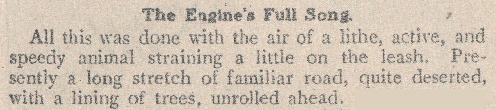 “Instantly the exhaust changed its note from a purr to a most menacing roar…. To such an accompaniment the pulse beats quicker, there comes an almost irresistible desire to burst into some wild war song, greater even than the immortal song of Roland—in defiance of the demons that howl invisible without.”