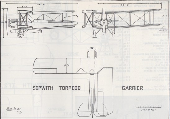 As described at the Royal Air Force Museum website, the Sopwith T.1 was the first purpose-designed aircraft-carrier-borne torpedo bomber, with its role to attack the German fleet at anchor, rather than engaging it when encountered on the high seas.