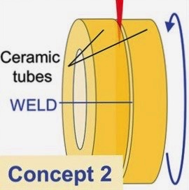 UF Version of Conventional Welding. To weld two opaque ceramic cylinders, the researchers focused the laser on a small gap between them. The idea of the gap was to give the laser a limited but adequate access to both pieces.