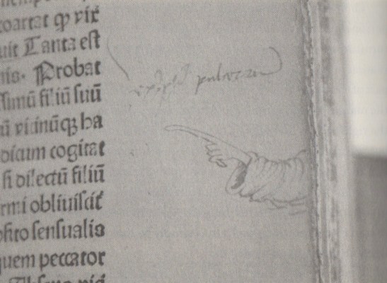 A hand-drawn manicule in a fifteenth-century printed book. This and other images from Shady Characters.